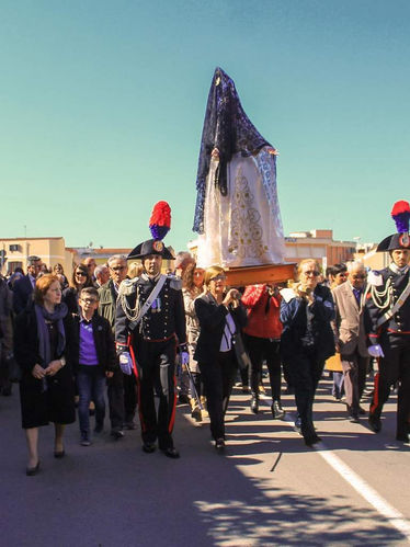 L'altro corteo con la Madonna, invece, usciva dall'Oratorio della Confraternita del Rosario ed era formato soltanto da donne, a eccezione dei quattro confratelli che portavano il simulacro vestito a lutto, col viso e il corpo coperto da un lungo velo nero.