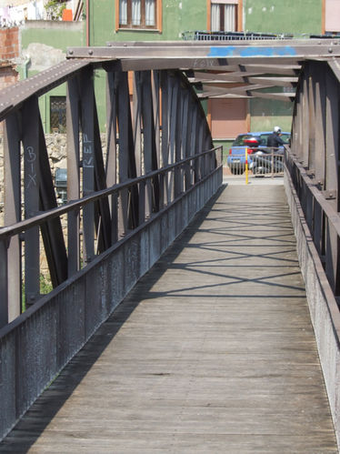 Tra il 1902 e il 1904, a seguito di vari disastri, vennero edificati alti argini in muratura all’interno dell’abitato e venne costruito un ponte in ferro in sostituzione di uno precedente realizzato in pietra e legno. In questi anni, per consentire l’attraversamento pedonale del Rio all’altezza di via Parrocchia, fu posizionata anche una Passerella in ferro lunga poco più di trenta metri e larga circa due, costituita di una sola campata e con il piano pedonale rivestito da listelli di legno naturale. La tecnologia costruttiva riprende i modi delle costruzioni in ferro della fine del 1800 di cui la Tour Eiffel è la massima espressione. Questo elemento rappresenta la comune matrice culturale europea.
